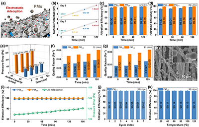 MOF均匀铠甲化及纳米纤维界面极化效应赋予膜强大表面电荷储存与持久电场,可高效捕获PM0.3和PM2.5。在32 L/min流速下,PM0.3过滤效率达99.12%,PM2.5达99.95%,即使在高流速或120?°C高温下仍保持PM0.3过滤效率99.15%,压力降仅轻微增加,展现优异空气通透性与高效过滤平衡。纤维膜在高尘环境长时间运行或多次清洗后仍可维持超过99%过滤效率,显示长期使用稳定性与可靠性。