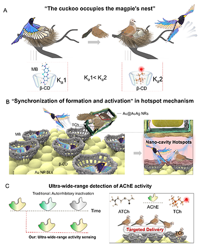 整个检测过程的巧妙之处,在于将酶的催化反应转化为界面分子竞争事件,并同步完成传感结构的锁定,设计包括以下三个方面:(1)酶促反应与靶向输送:当样品中存在目标酶——AChE时,它会催化底物水解生成产物巯基胆碱(TCh)。TCh分子被溶液中的金-银纳米棒捕获并输送到修饰有β-CD的超晶格界面;(2)竞争置换实现“占巢”:到达界面的TCh,凭借其与β-CD空腔更强的结合亲和力,将预先占据其中的报告分子MB竞争性地置换出来,迫使MB离开空腔扩散至周围环境。这一过程如同“鸠占鹊巢”,直接导致了界面处MB信号分子拉曼信号强度的变化;(3)共价锚定完成“锁巢”:成功“占巢”的TCh分子,通过其末端的巯基与超晶格的金表面形成牢固的金-硫共价键。这一作用将整个传感界面“锁定”在一个稳定的状态,并增强了纳米棒与基底之间的等离激元耦合。