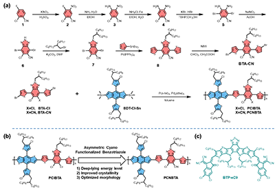 图1. a) PClBTA和PCNBTA的合成路线。b) PClBTA和PCNBTA的性能比较。c) BTP-eC9的结构。
