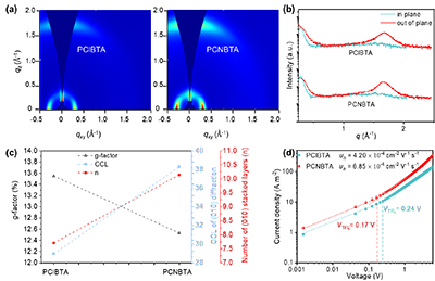 图3. a) PClBTA和PCNBTA纯膜的二维掠入射广角X射线散射图谱。b) 沿面外和面内方向的相应GIWAXS强度分布曲线。c) PClBTA和PCNBTA的g因子、(010)衍射的相干长度以及(010)堆积层数。d) 纯聚合物薄膜的空穴迁移率与陷阱密度。