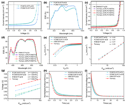 图4. a, b) 二元器件的J-V特性曲线(a)与外量子效率谱(b)。c, d) 三元器件的J-V特性曲线(c)与外量子效率谱(d)。e) 光伏器件的光电流随有效电压变化曲线。f) 光伏器件的短路电流密度及g) 开路电压随光强变化关系。h, i) 瞬态光电流(h)与瞬态光电压(i)测试。
