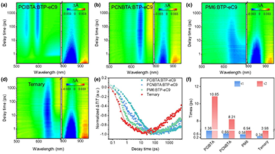 图5. a-d) 不同共混薄膜的飞秒瞬态吸收光谱二维彩图。e) 从给体提取的共混薄膜基态漂白信号动力学曲线。f) 根据瞬态吸收动力学数据估算的τ1与τ2时间常数。