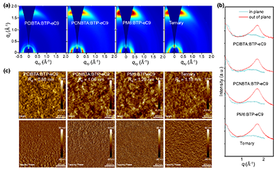 图6. a) 共混薄膜的掠入射广角X射线散射图谱。b) 共混薄膜的面内与面外方向线扫描强度分布。c) 共混薄膜的原子力显微镜图像。