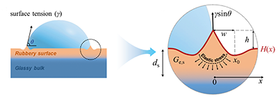 图1. 液滴界面润湿力诱导高分子玻璃体橡胶表面层发生弹性形变示意图。