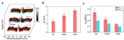 如图2,利用 AFM测量表面润湿脊的形貌从而获得了其高度和宽度;将高度和宽度代入公式 2,即可获得高分子玻璃体橡胶表面层弹性模量和厚度。他们发现,在 T = Tg - 10K 下,聚苯乙烯类高分子玻璃表面层厚度为 2 ~ 5 nm,且橡胶表面层厚度随着侧基尺寸增大而增厚;聚叔丁基苯乙烯(PTBS)> 聚4-甲基苯乙烯(P4MS)> 聚苯乙烯(PS)。此外,由于界面伪缠结的作用,橡胶表面层的弹性模量高于由常规拓扑缠结所定义的橡胶平台模量的数值(图 2)。这一方法首次实现了对玻璃态高分子表面弹性模量的测定,并且发现了由于界面伪缠结引起的橡胶表面层模量增大、硬度提高的现象;为我们理解高分子表面力学提供新的视角。