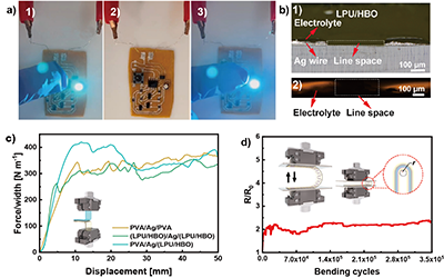 首先,利用聚四氢呋喃PTMEG异佛尔酮二异氰酸酯IPDI)、2,6-吡啶二甲醇(PDM)与超支化聚酰胺制备了一种含氢键作用的自修复聚氨酯LPU/HBO,图1a)作为基材,采用柔性电子打印机制备出具有多层结构(自修复基材、银线路、隔离层、胶体电解质与封装层)的新型自修复线路,并将其与多种电子元器件进行集成,成功构建出柔性自修复PCBs(图1b)。PCBs到机械损伤时胶体电解质在毛细管作用下渗入裂纹内部,银迁移过程提供通路;在PCBs工作电压的作用下,裂纹内部发生银迁移,逐渐生长出银枝晶,从而在裂纹处形成贯穿的金属电桥,恢复银线路的导电性能;同时,基底和封装层可以通过氢键作用恢复其结构完整性(图1c