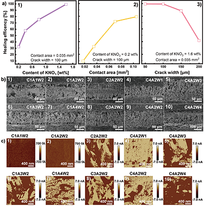 5. 导电自修复的影响因素。(a) 电解质浓度、浸润面积和裂纹宽度对银迁移自修复效率的影响。(b, c) 不同组合条件下形成的银枝晶的(b)SEM形貌和(c) AFM电流分布图。