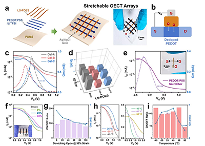 图7 可拉伸有机电化学晶体管(OECT)阵列的性能展示。(a) 基于LS-PDES电解质和PEDOT:PSS/LiTFSI电极线阵列在弹性基底上制备OECT阵列的流程示意图,以及所制备交叉阵列的照片。(b) OECT阵列的工作机制。(c) 3个OECT器件的转移特性曲线及对应的跨导(Gm)曲线,该器件采用中间行PEDOT:PSS/LiTFSI源极/漏极线,分别与3个LS-PDES电解质重叠形成。(d) 3×3 OECT阵列中各器件跨导的统计结果。(e) 基于PEDOT:PSS微纤维沟道与涂覆LS-PDES的银线接触构建的OECT器件的转移特性曲线及对应的跨导曲线。(f) 3×3阵列中单个OECT器件在不同拉伸应变下的转移特性曲线,插图为拉伸方向示意图。(g) 该OECT器件在30%应变下经过多次拉伸循环后的开关比(ON/OFF ratio)和跨导变化曲线图。(h) 该OECT器件在-40℃至80℃温度范围内的转移特性曲线。(i) 该OECT器件的开关比和跨导随温度变化的曲线图。
