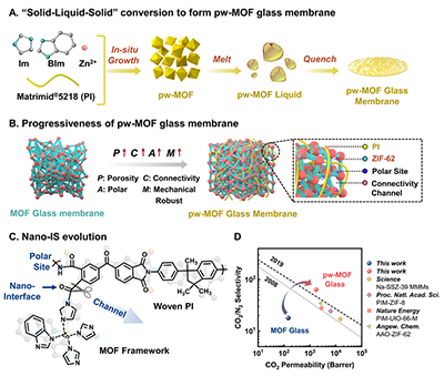 可液态加工的金属有机框架(MOF)玻璃重新定义了节能碳捕集膜的理想材料。然而,MOF玻璃膜仍存在孔隙连通性差、孔隙率不足和耐压性差的问题,阻碍了膜技术在烟气脱碳、天然气纯化等方面的可持续应用。