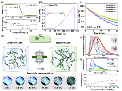在磷光来源方面,对比实验表明,单独的4TPA发色团仅在77 K低温下显示磷光,而空白样品LQ-Blank则无磷光,这证实液晶交联网络是产生室温磷光的关键结构。静水压实验进一步揭示,与4TPA粉末在高压下因分子紧密堆积导致发射峰持续红移不同,LQ-4TPA在压力超过8.4 GPa后其发射峰位保持稳定,说明液晶网络发挥了结构支撑作用,有效抑制了发色团的过度堆积与π π聚集。上述结果表明,液晶网络所构建的微观刚性环境是实现高弹性体中高效室温磷光的重要因素。