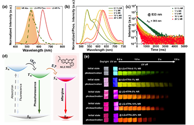 为实现多色磷光发射,本研究将荧光染料尼罗红(NR)引入LQ-4TPA体系,通过F?rster共振能量转移(FRET)策略,成功实现了从绿色到红色发射的连续调控。其关键在于给体磷光(533 nm)光谱与受体吸收光谱的良好重叠。随着NR浓度增加,533 nm处磷光峰减弱,600 nm处受体发射峰增强并最终主导发光。寿命测试证实了高效能量转移过程,给体寿命随浓度增加而缩短,受体发光寿命则从5.21 ns延长至毫秒级,实现了长余辉特性的有效传递。