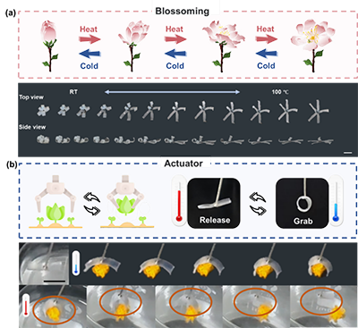 光-热双重响应的智能应用演示:该材料集成了独特的光控磷光“开关”特性与固有的热致形变能力,并成功应用于两类智能应用。其一为仿生液晶花,其花瓣能随温度变化规律性地开合,并同步实现磷光的“明-灭”切换;其二为智能抓手,可通过自身发出的磷光信号,实时、可视化地指示抓取状态。这两类演示应用生动展现了该材料在仿生及智能驱动领域的广阔应用潜力。
