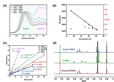 该团队开发了一种基于氨基酸平台制备聚氨基酯的高效合成新策略。该研究以氨基酸和环氧化物为起始原料,通过两步法合成了一系列结构各异的氮杂内酯单体(图1)。该方法具有廉价易得、结构丰富、原料可再生等优势,能够对氮杂内酯单体的N-取代基、环尺寸、内酯核取代基的位置与位阻以及立体构型进行定向修饰。TBD催化氮杂内酯开环聚合表现出“活性/可控”特征(图2)。聚合动力学研究表明,六元环氮杂内酯单体(TMOC)的表观聚合速率常数是七元环单体(TMOOC)的4.2倍;随着内酯核取代基链长的降低,表观聚合速率常数逐渐增大(图3)。热力学研究表明,增大内酯核取代基长度(C1-C4),能够降低Tc(24~-20 oC),获得更高单体转化率;其中,七元环氮杂内酯单体(TMOOC)具有最高的Tc(37 oC),表现出最高的单体转化率94%(图3)。解聚研究表明,合成的聚氨基酯都能够完全解聚为原始单体,且解聚速率常数与相应单体的聚合速率常数呈负相关(图4)。热性能分析表明,5种聚氨基酯为无定形高分子材料(Tg:-3~39 oC),PTBOC为半结晶材料,熔点为144oC。本研究成功构建了基于氨基酸的聚氨基酯合成平台,系统揭示了调控聚合与解聚过程的构效关系,为理性设计定制化聚氨基酯提供了重要理论依据与实践指导。