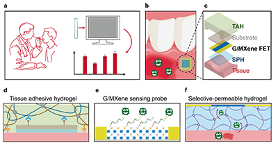 图1. TAHM 生物传感器的介绍。(a)主观医疗判断或繁琐实验室检测流程的示意图。 (b) TAHM 生物传感器的使用场景:黏附于口腔内壁,用于原位炎症因子检测。 (c) TAHM 生物传感器各组成部分的示意图。 (d) 皮肤黏附水凝胶贴片, (e) 基于石墨烯/MXene 的传感探针,和 (f)选择性渗透水凝胶膜的示意图。