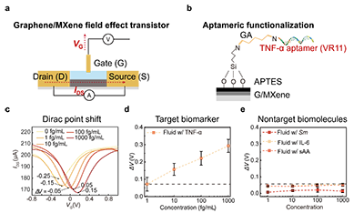 图2. 基于石墨烯/MXene场效应晶体管的 TNF-α 检测。 (a) 场效应晶体管工作原理和(b) TNF-α 适配体 (VR11) 的适配体功能化示的示意图。(c) 不同浓度 TNF-α 条件下的 Dirac 点位移检测结果。 (d) ΔV位移随 TNF-α 浓度变化的定量关系图。 (f) ΔV 位移对不同非靶标生物标志物的响应结果,包括变形链球菌 (Sm)、白细胞介素-6 (IL-6) 及唾液淀粉酶(sAA)。