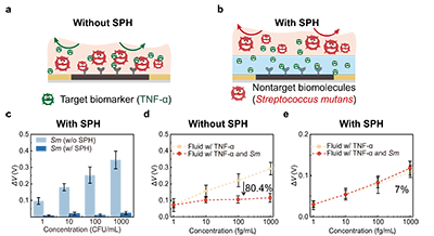 图3. 选择性水凝胶渗透膜 (SPH) 的分子筛分性能。(a) 未引入 SPH 时的检测状态示意图:靶标生物标志物与非靶标生物分子同时吸附于传感贴片表面,产生生物污染 (biofouling),从而影响检测结果的准确性。 (b) 引入 SPH 后的检测状态示意图:SPH 有效阻隔非靶标生物分子,仅允许靶标生物标志物渗透并富集至传感贴片表面,从而提高检测结果的真实性。 (c) 有无 SPH 条件下变形链球菌 (Sm) 检测结果的对比,表明 SPH 能够有效阻隔变形链球菌的干扰。 (d) 无 SPH 条件下,在纯 TNF-α 溶液与混合变形链球菌的 TNF-α 溶液中,ΔV位移随 TNF-α 浓度变化的对比结果,检测信号出现 80.4% 的偏移。 (e) 有 SPH 条件下,在纯 TNF-α 溶液与混合变形链球菌的 TNF-α 溶液中,ΔV位移随 TNF-α 浓度变化的对比结果,检测信号偏移降低至 7%。