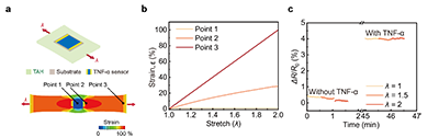 图4. TAHM 生物传感器的应变不敏感特性。(a) 传感贴片附着于可拉伸生物黏附水凝胶上的示意图及其有限元分析结果:分别计算传感贴片(Point 1)、传感贴片邻近区域水凝胶 (Point 2) 以及远端水凝胶区域 (Point 3) 在拉伸条件下的应力分布及其随拉伸率变化的应力响应(b)。(c) 在不同拉伸率条件下有无 TNF-α 时的检测结果对比,表明信号变化主要来源于 TNF-α 浓度变化。