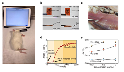 图5. TAHM 生物传感器的动物实验验证。(a) TAHM 生物传感器应用于麻醉天竺鼠口腔内进行 TNF-α 检测的实物照片。 (b) TAHM 生物传感器的实物照片。 (c) 组织黏附水凝胶贴附于猪牙龈表面的实物照片。 (d) TAHM 生物传感器在麻醉天竺鼠口腔内进行 TNF-α 检测时获得的实时信号数据。 (e) 取自麻醉天竺鼠口腔分泌物的离体检测结果,对比了有无SPH条件下的信号变化。