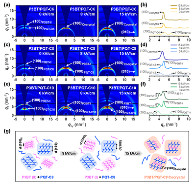 图2. (a, c, e) P3BT/PQT共混物薄膜的2D-GIWAXS图及其(b, d, f) 1D-GIWAXS图。(g) P3BT/PQT-C8共混物在外电场下的共结晶示意图。