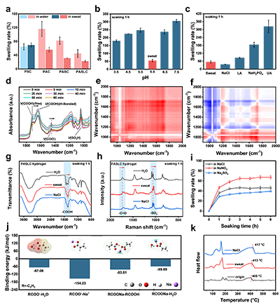 为验证机制的科学性,团队通过组分对比、光谱分析、理论计算等系列测试形成完整证据链:明确了AAc在离子调控中的核心作用,SBMA与LMA的协同优化增强了网络致密性与抗溶胀能力;通过原位FT-IR、拉曼光谱等表征,证实盐离子驱动分子间相互作用增强、链间距离缩短;DFT计算从理论上验证了Na+与-COO-结合的稳定性,为离子调控机制提供了有力支撑。