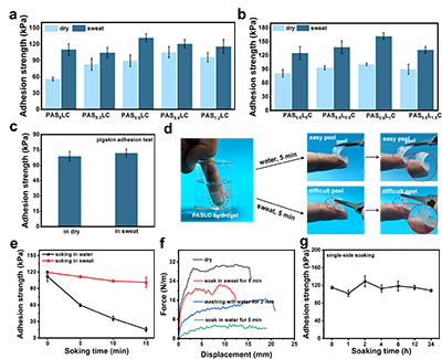 在粘附与剥离性能上,图示清晰呈现了优化后的水凝胶配方在汗液环境中保持高粘附强度,对干燥和湿润猪皮的粘附力均表现优异,且24 h连续汗液浸泡后性能依旧稳定;而在纯水中,粘附强度可快速下降至无痛剥离水平,且无残留,避免损伤皮肤屏障。同时,短暂水洗后仍能维持足够粘附力,有效防止日常使用中意外脱落,兼顾了实用性与安全性。