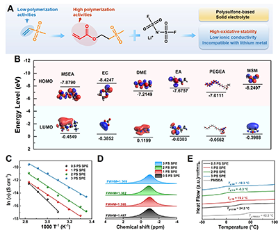 传统的乙烯基脂肪族砜类单体的自由基聚合活性较低,为了获得可聚合的脂肪族聚砜单体,团队设计了高自由基聚合活性的丙烯酸2-(甲基砜基)乙酯(MSEA),通过凝胶色谱可以发现聚合物的重均分子量可达到10×105,表明设计的分子结构已经克服乙烯基砜单体难以通过自由基聚合的缺陷,将MSEA和LiFSI混合后通过紫外光引发聚合,通过这种无溶剂的方法在电极表面进行原位聚合构筑电解质层(PS SPE)。