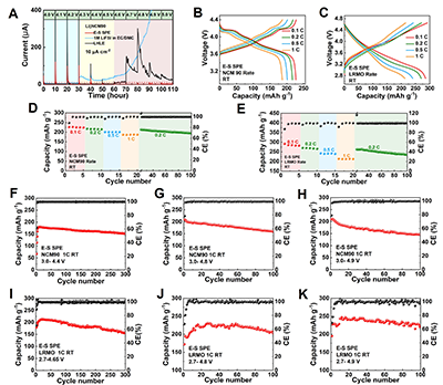 图6. E-S SPE室温下匹配NCM90和LRMO正极的电池性能