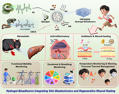 水凝胶生物粘合剂因其卓越的生物相容性和可调节的物理化学特性,已被广泛应用于伤口护理、人机界面和植入式生物电子设备。尽管这些粘合剂在加速伤口愈合方面表现出临床效用,但仅用单一材料同时恢复受损皮肤的组织结构和感觉功能仍是一项重大挑战。作为一种灵活且耐用的界面,水凝胶生物粘合剂能够感知人体运动和生理线索,有效模拟皮肤的体感功能。关键是,它同时支持皮肤生物电子学中的伤口愈合和多信号监测。