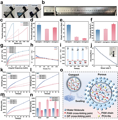 在本研究中,水凝胶的骨架由化学交联的聚丙烯酰胺(PAM)网络构成,为材料提供了优异的柔韧性和结构稳定性,从而能为伤口部位提供可靠的力学保护与支撑。同时,羧甲基壳聚糖(CMCS)与丝胶蛋白(SS)之间通过京尼平(GP)共价交联,并与PAM网络互穿,形成了稳固的双网络结构。CMCS丰富的羧基、羟基与SS的酰胺基团之间形成的多重氢键、静电相互作用及GP介导的共价连接,共同构成了动态可逆的物理交联点,赋予了水凝胶优异的力学性能、自主自愈合能力及可注射性。值得注意的是,GP作为一种天然交联剂,其与CMCS/SS的特定反应不仅构建了稳定的共价网络,还因其形成的醌式结构而赋予了材料显著的光热转换特性。通过调控CMCS与SS的比例,可以实现对水凝胶模量、韧性和孔隙结构的精确调控,从而适配不同伤口部位的机械与生理需求。