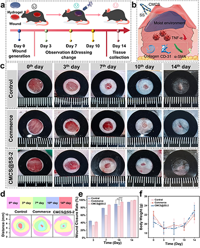 近日,陕西科技大学生物质与功能材料研究所王学川教授、党旭岗副教授报道了一种可注射自愈多功能生物质基水凝胶生物粘合剂,采用羧甲基壳聚糖(CMCS)、丝胶蛋白(SS)和天然保湿因子(NMF)作为原料,实现皮肤生物电子与再生伤口愈合的综合管理。水凝胶生物粘合剂表现出显著的溶胀能力(1094.46%),组织渗出物的快速吸收,以及显著的止血效能。与此同时,水凝胶生物胶对温度、应力应变和生物电信号表现出高度敏感,能够有效检测各种人体运动和温度预警。值得注意的是,水凝胶生物粘合剂具有可调调模量,精确匹配伤口部位皮肤组织的机械性能,促进伤口近乎完全愈合,并在14天内显著降低促炎因子水平。总体而言,作为一种灵活且耐用的界面,水凝胶生物粘合剂能够感知人体运动和生理线索,有效模拟皮肤的体感功能。关键是,它同时支持皮肤生物电子学中的伤口愈合和多信号监测。因此,本研究为开发多功能生物质基水凝胶提供了一种可行策略,在综合再生伤口愈合与皮肤生物电子学领域展现出应用潜力。