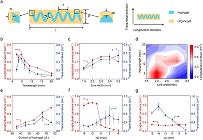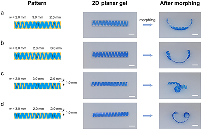 目前许多的研究工作利用周期性条纹、圆形或其他多边形形状的平面凝胶片实现了三维形状转变。然而,对平面凝胶片卷曲方向的控制关注较少。一般来说,凝胶在外部刺激下会经历各向同性的膨胀/收缩,因此卷曲变形可以发生在任何方向。这导致卷曲方向不可预测,纵向、横向和对角卷曲都可能发生。图案化结构可以通过改变图案形状来调节应力分布。尽管如此,大多数形状转变是由图案面内或面外不匹配导致的。在图案化结构的凝胶片中,实现可预测的卷曲方向和可编程的形状转变仍然被研究的较少。