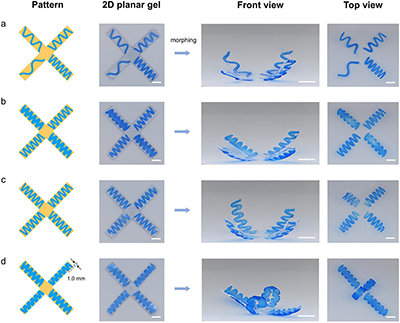 该研究不仅提出了一种新型的可编程三维形变机制,也为软材料从二维图案化片向三维结构的可控转变提供了新的仿生策略。所开发的凝胶材料在软体驱动器、自适应器件和生物医学工程等领域具有广阔的应用前景。