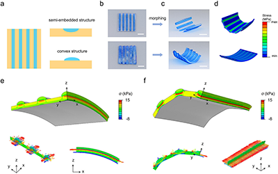 此外,半包埋结构展现出与传统外凸结构相反的形变行为。通过有限元分析条纹图案凝胶片的形变形为,并揭示其内部应力分布与形变机制。在半包埋结构中,垂直于条纹的界面应力大于沿条纹的拉伸应力。垂直于条纹的界面拉伸应力主要由水凝胶内部膨胀引起的内部压力驱动,从而对周围油凝胶产生压缩力。水凝胶条对周围油凝胶的压缩力是弯曲的主要驱动力,油凝胶中的界面拉伸应力主要调节弯曲方向。