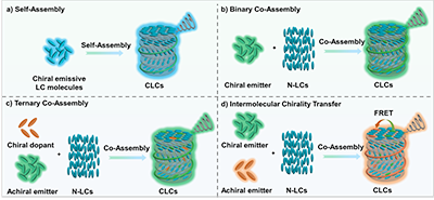 论文进一步梳理了构建具有CPL活性胆甾相液晶材料体系的三大核心设计策略。第一,液晶分子自组装策略:通过共价键将发光基团与手性单元集成于单一液晶分子中,利用其自组装能力直接构筑具有螺旋有序结构的发光液晶相。该策略所得材料结构均一、手性与发光功能高度协同,但分子合成通常较为复杂。第二,多组分共组装策略:该策略具有高度灵活性,可分为两类:(i)将兼具发光与手性功能的分子作为掺杂剂引入非手性液晶主体中,使其同时充当发光中心与手性源;(ii)将非手性发光分子、手性掺杂剂与非手性液晶主体三者共混组装,实现手性源与发光中心的功能解耦。后者不仅简化了分子合成,还便于独立优化各组分性能,有利于多功能集成。第三,手性信号传递策略:借助CLCs基质的螺旋结构作为手性模板,或通过F?rster共振能量转移(FRET)等过程,将手性信息高效传递至非手性发光客体,诱导其产生CPL。该策略有效拓展了发光材料的选择范围,并显著提升了CPL性能。上述策略不仅显著增强了发光不对称因子(glum),还为构建对外部刺激(如光、热、电场等)响应的动态CPL体系奠定了坚实的材料基础。