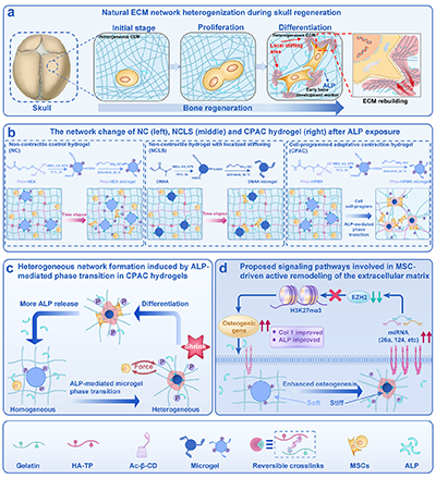 干细胞分化过程中会动态重塑并硬化细胞外基质,从而产生具有阶段特异性的生物力学信号,引导组织发育。然而,传统生物材料旨在模拟成熟细胞外基质的硬度,因其静态、不可演化的特性,忽视了基质硬度的时空异质性。为此,研究人员开发了一种细胞程序化自适应收缩水凝胶。该水凝胶能使间充质干细胞通过碱性磷酸酶(一种早期成骨标志物)介导的亲水-疏水转变及微凝胶收缩,主动重塑其微环境。这种细胞程序化的重塑建立了局部力学异质性,并通过正反馈环路促进成骨分化。机制上,这种动态演化的基质增强了力传导相关的微小RNA表达,抑制了EZH2,并减少H3K27三甲基化,从而激活成骨转录。在体内实验中,装载间充质干细胞的CPAC水凝胶显著促进了大鼠颅骨缺损的修复。这些发现提出了一种细胞指导、动态可演化生物材料的新范式,该范式能重现天然细胞外基质的适应性,从而协调干细胞命运和组织形态发生。