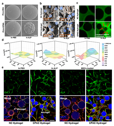 2:(aALP处理前后Phos-HEAPhos-HPMA微凝胶的SEM图像;bSEM(c)共聚焦图像显示ALP处理后水凝胶网络结构的变化;d)热图显示了(i) PBS、(iiALP和(iiiMSC封装处理72小时后CPAC水凝胶中局部有效杨氏模量分布。(eCol1ALPNCCPAC水凝胶中的免疫荧光染色