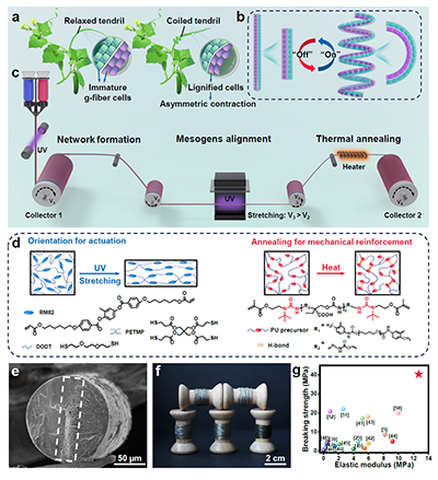 近杭州师范大学材料与化学化工学院刘俊秋/吴柏衡团队提出了一种连续挤出纺丝平台,用于构筑具有内在结构非对称性的Janus液晶弹性体纤维,其设计灵感来源于植物卷须等天然仿生结构。该方法将高可逆驱动的LCE网络与可动态重排的共价PU网络协同集成,通过动态键交换实现液晶取向的按需编程与重构驱动。所得Janus纤维在力学性能和功能集成方面表现出显著优势,能够实现自适应抓取、刺激响应的定向运动,并可规模化织造成智能织物用于热管理。该工作通过统一材料响应性与结构可编程性,为构筑具备环境适应能力的仿生软体机器人和智能纤维系统提供了新的设计范式。