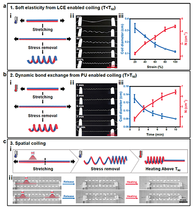 作者进一步提出并验证了多种基于材料非对称响应的形状编程策略:既可在室温条件下利用LCE的软弹性实现机械诱导纤维自发卷曲,也可在高温下借助PU的应力松弛行为完成热诱导编程,并结合近红外激光实现空间选择性激活,从而在单根连续纤维中引入驱动行为的空间异质性(图2