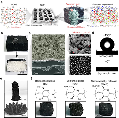 进一步,研究人员对FHE单元进行了详细的表征分析。首先,图2a从分子角度进一步解释了硅氧烷(-Si-O-)骨架和侧甲基赋予了FHE优异的柔韧性和化学稳定性。Ppy外壳通过界面限域聚合方法均匀沉积在TEMPO-CNF表面(图2b)。FHE聚吡咯外壳独特的微纳结构,使其对液态水表现出超疏水性,同时对水蒸气保持高度渗透性,具有很好的疏水防护(图2cd)。FHE单元也可实现多级结构制备,这对于在不同的场景和不同维度的湿度管理应用至关重要(图2e)。值得注意的是,FHE单元也可以使用细菌纤维素(BC)、海藻酸钠(SA)和羧甲基纤维素(CMC)等多种生物质材料制备而成,表现出很好的普适性(图2f)。