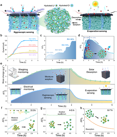 研究人员进一步对FHE吸湿感知性能进行表征和分析。FHE吸湿感知机制示意图如图5a所示,FHE单元在吸湿状态下,观察到吸湿传感器信号(ΔI/I0)的增加,这归因于LiCl水合引起的离子水合和电荷传输。在解吸状态下,传感器信号降低,对应于水合Cl-Li+的减少。电流变化分析(图5b)以及湿度梯度下传感信号的同步变化(图5c)进一步阐明FHE单元的吸湿感知行为。另外,从高湿度到底湿度过程中,由于水合离子的减少,传感信号也会呈现下降趋势(图5d)。与用于研究FHE吸湿-解吸行为的传统称重技术相比,ΔI/I0曲线的电信号变化表现出很强的相关性(图5e),而传感信号可实时监测水分子的吸湿和状态,可以更直观地观察到FHE单元自身状态,而称重无法实现这一功能。此外,图5f-h中的ΔI/I0曲线使我们能够更细致的分析FHE单元在吸湿、平衡和解吸状态下的离子变化行为。