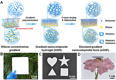 针对上述问题,东华大学张超研究员、江南大学刘天西教授利用带电MXene纳米片在静电场作用下形成的浓度梯度分布,结合其在聚合物单体原位聚合过程中发挥的物理交联作用,制备出兼具MXene纳米片含量梯度与孔隙率梯度的双重梯度多孔高分子复合材料(图1)。