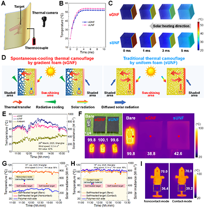 图3. 梯度多孔高分子复合材料的户外自降温热伪装性能:(A) 梯度多孔高分子复合材料户外热伪装中的应用示意图。(B) 基于太阳吸收率和中红外发射率特性的梯度多孔结构与均匀多孔结构伪装表面的平衡表面温度模拟。(C) 梯度多孔结构与均匀多孔结构在特定热流条件下的有限元热传导比较。(D) 梯度多孔结构与均匀多孔结构在户外热伪装中工作原理的对比示意图。(E) 梯度多孔结构与均匀多孔结构覆盖下的太阳辐照强度与实时温度变化曲线。(F) 在直射阳光和高温环境下,覆盖与未覆盖梯度多孔结构与均匀多孔结构的发热坦克模型(表面温度100 oC)的照片与红外热像图。(G, H) 非接触模式与接触模式下,聚合物富集侧表面与目标的表观温度随时间变化曲线。插图显示两种伪装模式下的温度测量位置示意图。(I) 发热温度为70 oC的直升机模型在非接触模式与接触模式下使用梯度多孔结构进行红外伪装的热像图。
