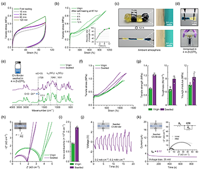 力学测试显示,Chi-Binder具有典型的粘弹性行为,在循环拉伸后能快速恢复模量和韧性,其自修复效率在室温12小时内可达95%以上,在电解液中仍可保持自修复与粘附性。浸泡于电解液后,材料可发生轻微溶胀,由于强烈的 Zn2+-羧酸盐配位相互作用,力学性能不降反升,同时离子电导率提升近一倍,说明其能有效协调电解质浸润与结构完整性之间的平衡。