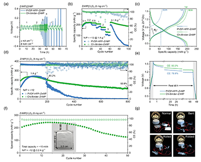 通过电化学性能测试,验证了Chi-Binder对锌粉电极电化学性能的提升。原位光镜观察发现,Chi-Binder电极在200分钟的锌沉积过程中表面保持平整,无气泡产生;而PVDF-HFP电极则出现不规则沉积并伴有气泡产生。对称电池测试中,Chi-Binder-ZnMP电极在0.5 mA cm-2/0.5 mAh cm-2 条件下循环寿命超过700小时,远优于对照电极。即使在深度放电条件下,电极仍表现出良好的循环稳定性。全电池测试中,采用Chi-Binder的ZnMP||V2O5电池在高倍率下容量保持率更高,且具备良好的抗自放电能力和机械柔韧性,在弯曲、折叠等恶劣条件下仍能稳定工作。