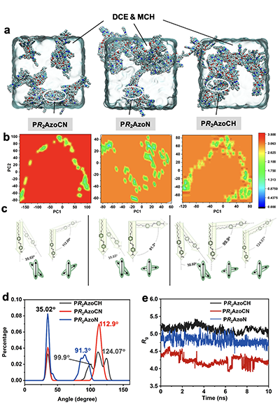 图3. 不同聚合物9聚体在混合溶剂中手性自组装过程中分子动力学模拟结果。