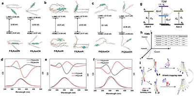 为揭示手性反转的内在机制,研究结合了分子动力学(MD)与含时密度泛函理论(TD-DFT)计算建立多尺度理论模型(图3,4)。结果显示,吸电子取代基可增强偶极-偶极相互作用使得体系具有更深自由能极小值与更紧密堆积,并形成更致密有序的堆积结构,而弱电子效应体系则呈现构象柔性与多取向共存,同时二者之间具有面向的取向分布差异。TD-DFT计算表明,–CN降低了LUMO能级并增强电荷转移。这导致跃迁偶极矩(TDM)的大小和方向发生显著变化,几乎呈现相反取向。该偶极矢量预设相邻单元的优选扭转角,在动力学聚集中锁定相反螺旋取向,从而导致CD信号完全反转:吸电子侧链呈负信号,给电子侧链呈正信号,与实验一致。相比之下,–CH?因偶极较弱而对手性中心空间位置更敏感,表现为双重调控机制;而无末端取代基体系(P(R/S)?/?AzoH)则因偶极不足不产生手性表达。