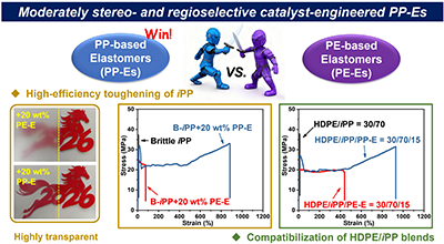 聚丙烯基弹性体(PP-Es) 作为一种优异的弹性体材料,与广泛使用的聚乙烯基弹性体(PE-Es) 相比,在力学强度、熔点以及与聚丙烯的相容性等方面具有突出优势,但其高效、低成本合成仍面临挑战。天津大学材料科学与工程学院潘莉教授团队在《Macromolecules》上发表最新研究,独辟蹊径地采用一类被忽视的中等立体与区域选择性双(酚-醚)铪催化剂(O4-CAT),成功实现了高性能PP-Es的高效、节约型合成。研究发现,适度的立构与区域缺陷可在显著降低α-烯烃用量的前提下,有效调控聚合物的结晶行为,从而制备出兼具高熔点、高强度与优异弹性的PP-Es,其综合性能超越商用PE-Es。更为重要的是,系统研究揭示了PP-Es在两大关键应用中的卓越性能:一方面,可高效增韧脆性等规聚丙烯(iPP),在大幅提升断裂伸长率的同时,优异地保持其强度与透明度;另一方面,作为增容剂,能显著改善高密度聚乙烯(HDPE) 与iPP不相容共混物的界面与力学性能,并首次明晰了增容剂类型、共混物相组成与最终性能提升之间的构效关系,为聚烯烃的高值化回收与改性提供了坚实的理论与数据支撑(图1)。