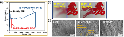 图3 增韧iPP的系列表征:(a) 应力-应变曲线; (b) 视觉透明性对比(薄膜置于剪纸前2 cm处); (c) 冷冻脆断面SEM图像 (×500)