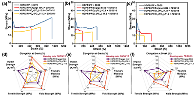 图4 增容不同比例HDPE/iPP共混物的力学性能:(a–c) 应力-应变曲线; (d–f) 关键力学性能雷达图(拉伸和冲击性能)