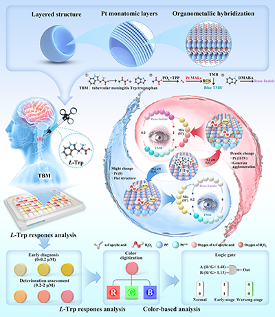 为解决这一问题,杭州师范大学材料与化学化工学院黄又举教授团队从生物传感器探针材料的设计入手,通过材料设计、多色信号整合以及智能数据分析,研发出一种基于铂基超晶格(Pt MALs)的交互式可视化生物传感器,以“阈值突跃式”颜色变化为核心,实现了TBM的快速精准诊断与病情动态监测,解决了结核性脑膜炎早期诊断中生物标志物动态非线性变化监测的问题。这种超晶格材料通过配位键与范德华力精准组装,形成原子级分散的铂层与有机配体双层结构的单原子层超晶格探针,如同为L-Trp量身打造的“智能信号转换器”,能将分子浓度变化直接转化为肉眼可辨的颜色信号。